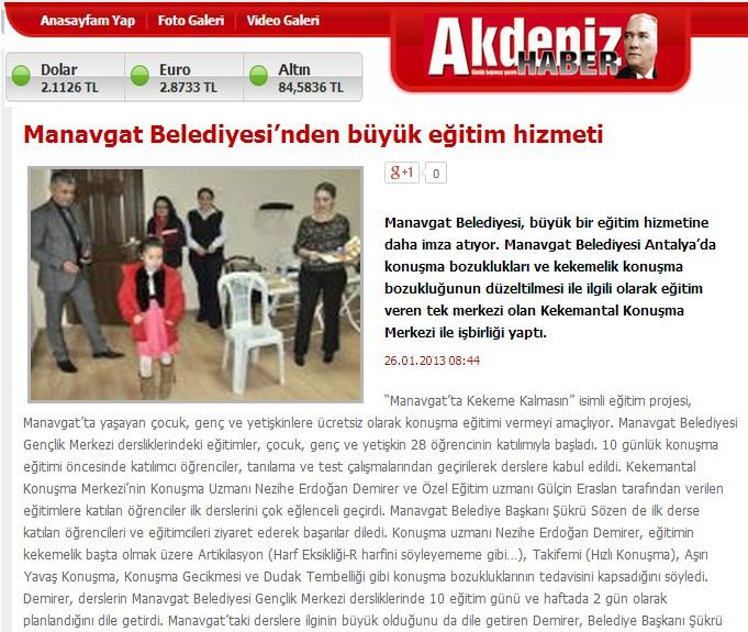 Manavgat Belediyesi , büyük bir eğitim hizmetine daha imza atıyor . Manavgat Belediyesi Antalya ’ da konuşma bozuklukları ve kekemelik konuşma bozukluğunun düzeltilmesi ile ilgili olarak eğitim veren tek merkezi olan Kekemantal Konuşma Merkezi ile işbirliği yaptı .